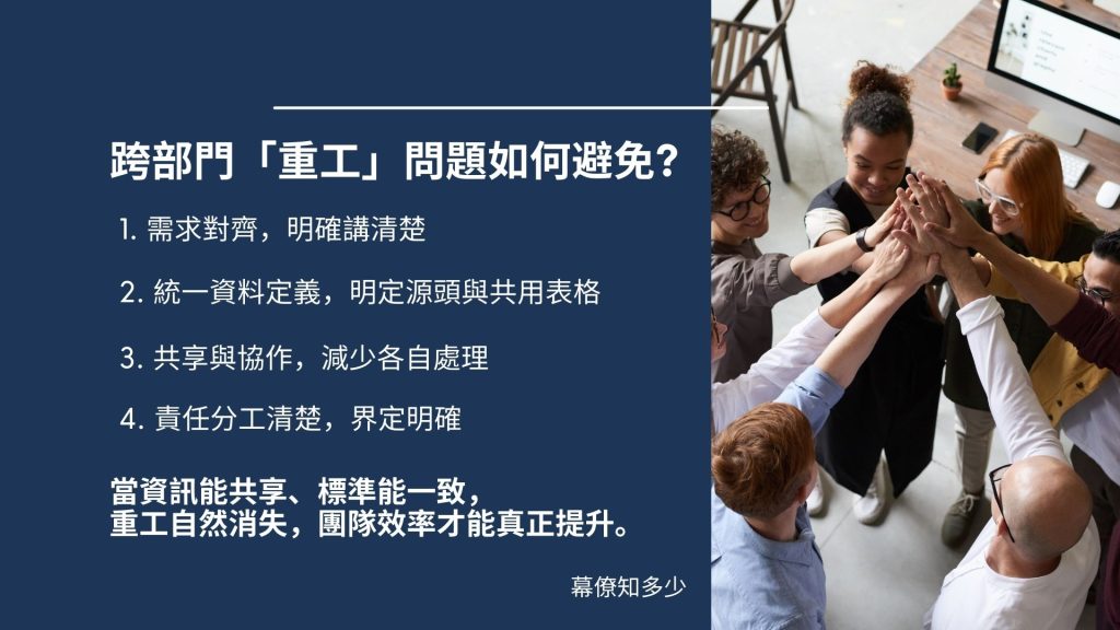而是沒有把資料、需求與知識整合好,不僅浪費人力、浪費資源,還產生了不一致的結果。唯有做好 跨部門知識管理+共同溝通平台 + 資料管理,才能避免重工。