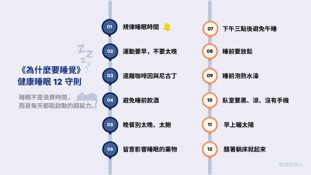 《為什麼要睡覺?》中提到,如果以下 12 點真的太難做到,至少請先做到第 1 點。